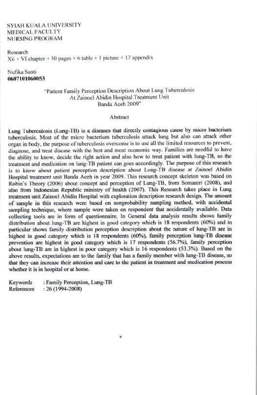 Nufika Santi, PERSEPSI KELUARGA PASIEN TENTANG PENYAKIT TB – PARU DI RUANG RAWAT INAP PARU RUMAH SAKIT UMUM DR. ZAINOEL ABIDIN BANDA ACEH. Banda Aceh Fakultas Kedokteran,2009
