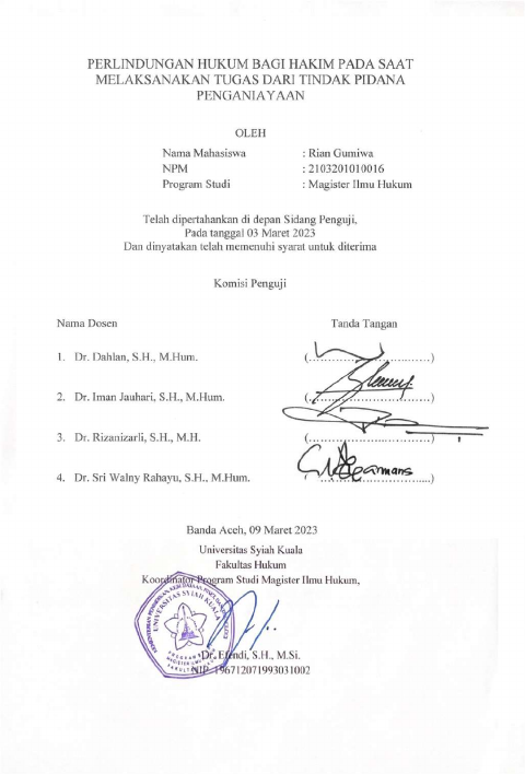 Rian Gumiwa, PERLINDUNGAN HUKUM BAGI HAKIM PADA SAAT MELAKSANAKAN TUGAS DARI TINDAK PIDANA PENGANIAYAAN. Banda Aceh Fakultas Hukum,2023