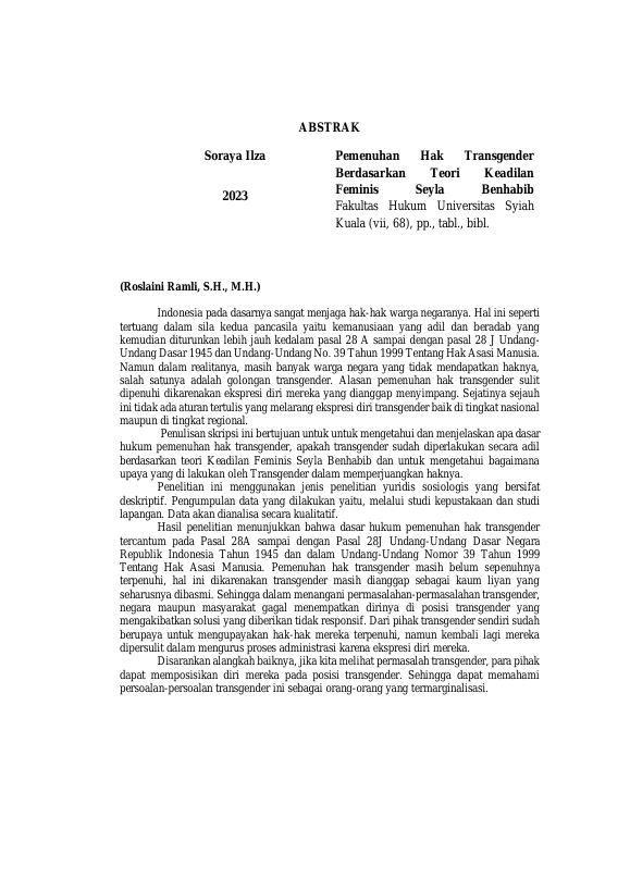 SORAYA ILZA, PEMENUHAN HAK TRANSGENDER BERDASARKAN TEORI KEADILAN FEMINIS SEYLA BENHABIB. Banda Aceh Fakultas Hukum,2023