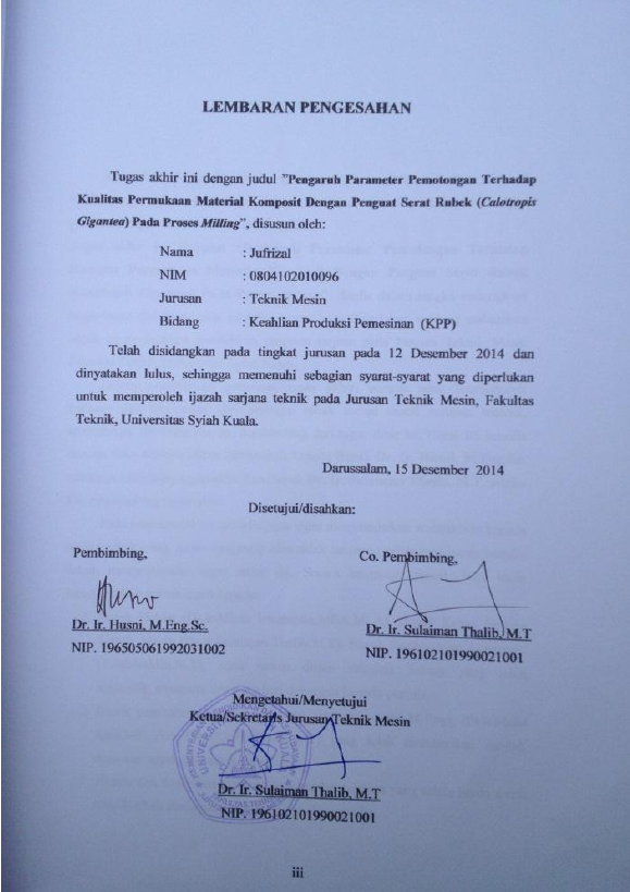 jufrizal, PENGARUH PARAMETER PEMOTONGAN TERHADAP KUALITAS PERMUKAAN MATERIAL KOMPOSIT DENGAN PENGUAT SERAT RUBEK (CALOTROPIS GIGANTEA) PADA PROSES MILLING. Banda Aceh Fakultas Teknik - Teknik Mesin,2014
