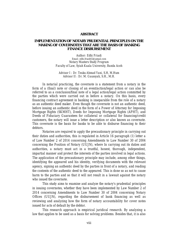 Edhi Friadi, IMPLEMENTASI PRINSIP KEHATI-HATIAN NOTARIS TERHADAP PEMBUATAN COVERNOTE YANG MENJADI DASAR PENCAIRAN PEMBIAYAAN PERBANKAN. Banda Aceh Fakultas Hukum Magister Kenotariatan,2023