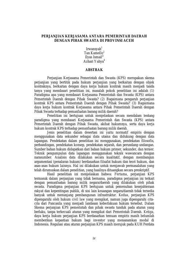 IRWANSYAH, PERJANJIAN KERJASAMA ANTARA PEMERINTAH DAERAH DENGAN PIHAK SWASTA DI PROVINSI ACEH. Banda Aceh Program Doktor Ilmu Hukum Universitas Syiah Kuala,2023