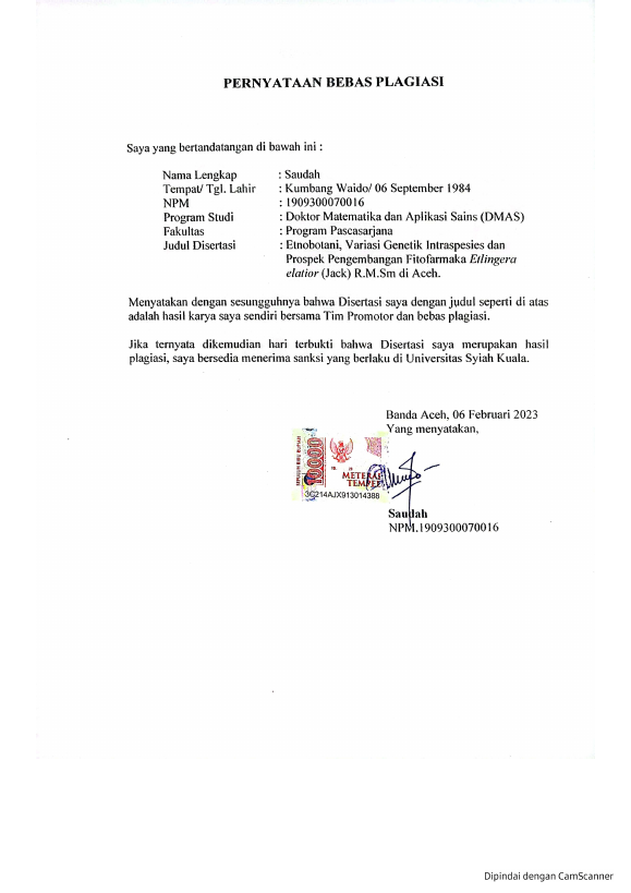 Saudah, ETNOBOTANI, VARIASI GENETIK INTRASPESIES DAN PROSPEK PENGEMBANGAN FITOFARMAKA ETLINGERA ELATIOR (JACK) R.M.SM DI ACEH. Banda Aceh Fakultas Pasca Sarjana,2023