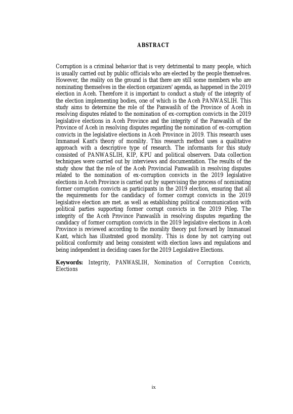 Muhd. Arbiansyah Farthuby, INTEGRITAS PANWASLIH PROVINSI ACEH DALAM PENYELESAIAN SENGKETA PENCALONAN MANTAN NARAPIDANA KORUPSI PADA PEMILU TAHUN 2019 DI ACEH. Banda Aceh Fakultas Ilmu Sosial dan Ilmu Politik,2023