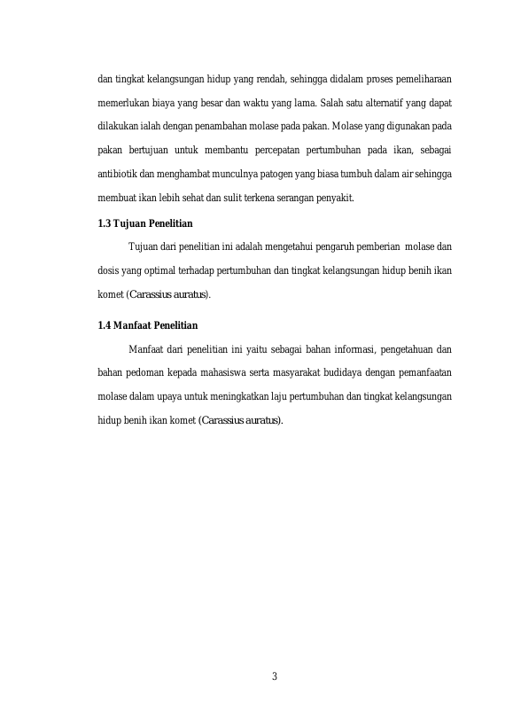 YUSDI JUANDA, PENGARUH PEMBERIAN MOLASE TERHADAP PERTUMBUHAN DAN TINGKAT KELANGSUNGAN HIDUP PADA BENIH IKAN KOMET (CARASSIUS AURATUS). Banda Aceh Fakultas Kelautan dan perikanan,2023