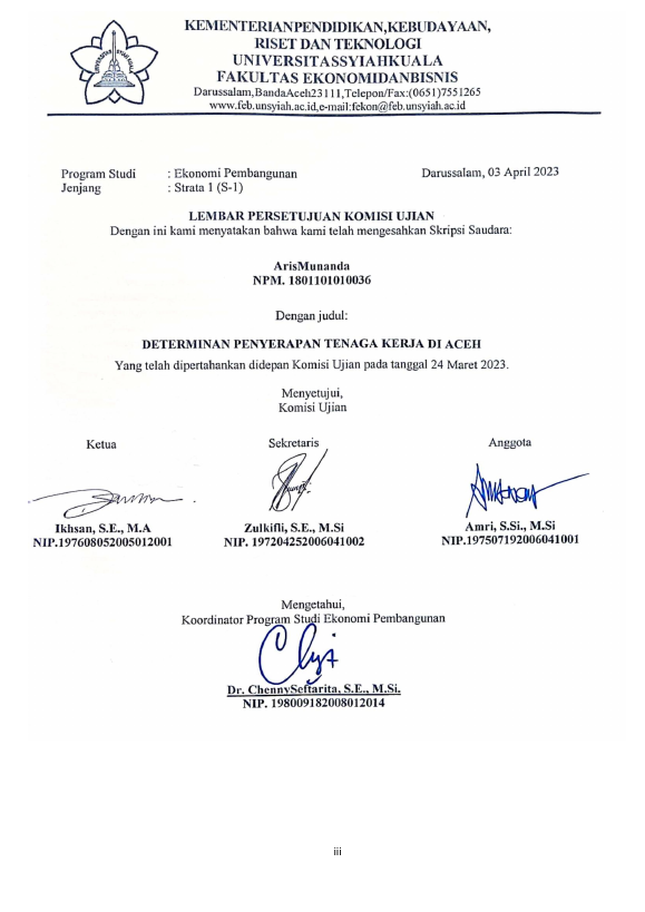 ARIS MUNANDA, DETERMINAN PENYERAPAN TENAGA KERJA DI ACEH. Banda Aceh Fakultas Ekonomi dan Bisnis,2023