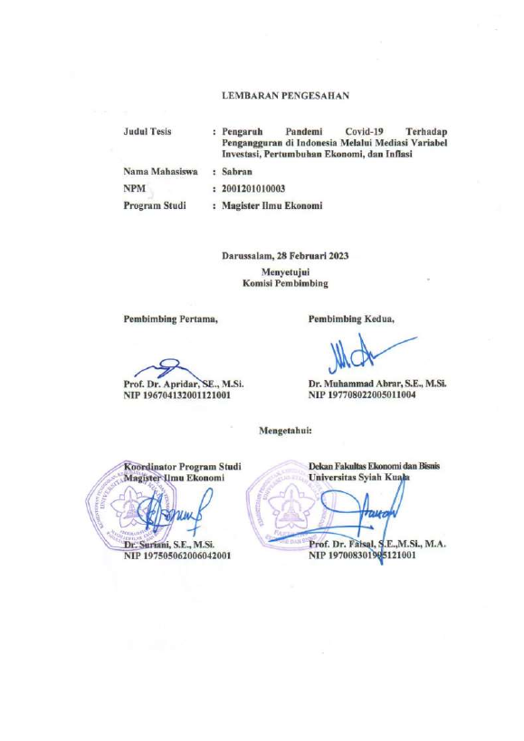 Sabran, PENGARUH PANDEMI COVID-19 TERHADAP PENGANGGURAN DI INDONESIA MELALUI MEDIASI VARIABEL INVESTASI, PERTUMBUHAN EKONOMI, DAN INFLASI. Banda Aceh Program Studi Magister Ilmu Ekonomi,2023