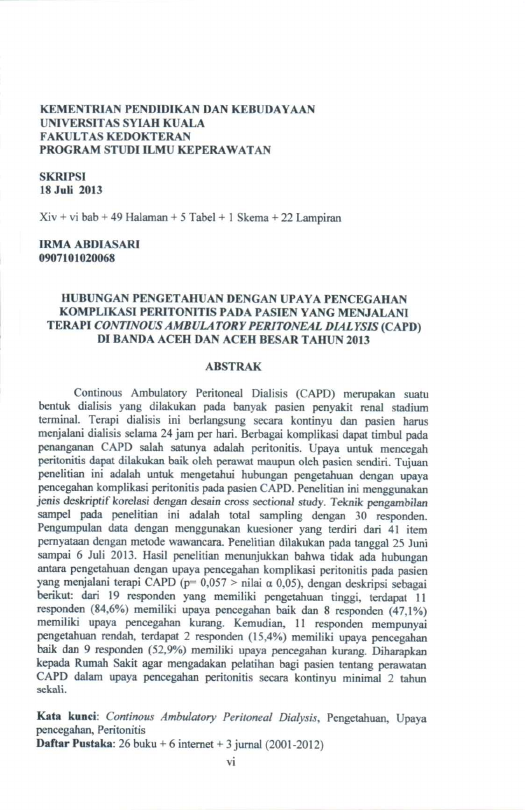 Baca Juga : HUBUNGAN PENGETAHUAN DENGAN UPAYA PENCEGAHAN KOMPLIKASI PERITONITIS PADA PASIEN YANG MENJALANI TERAPI CONTINOUS AMBULATORY PERITONEAL DIALYSIS (CAPD) DI BANDA ACEH DAN ACEH BESAR TAHUN 2013 (Ns. Irma Abdiasari, S.Kep, 2014)