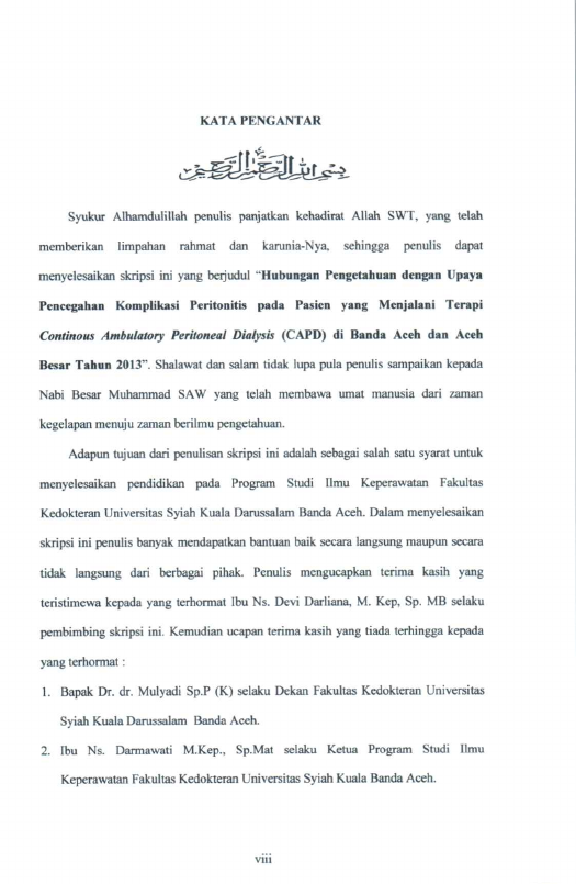 Irma Abdiasari, HUBUNGAN PENGETAHUAN DENGAN UPAYA PENCEGAHAN KOMPLIKASI PERITONITIS PADA PASIEN YANG MENJALANI TERAPI CONTTNOUS AMBULATORY PERITONEAL DIALYSIS (CAPO) DI BANDA ACEH DAN ACEH BESAR TAHUN 2013. Banda Aceh Fakultas Keperawatan,2013