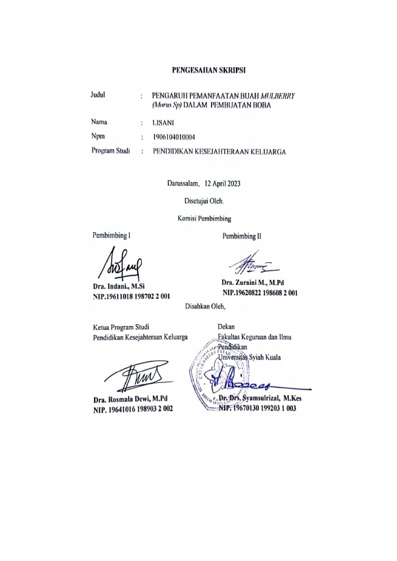 Lisani, PENGARUH PEMANFAATAN BUAH MULBERRY (MORUS SP) DALAM PEMBUATAN BOBA. Banda Aceh Fakultas KIP PKK,2023