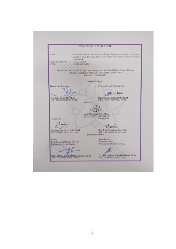Baca Juga : EKSPRESI PROTEIN VIPERIN PADA ORGAN PERNAPASAN AYAM KAMPUNG DAN ITIK YANG DIINFEKSIKAN ISOLAT VIRUS NEWCASTLE DISEASE VIRULEN ASAL ACEH (Tiara Azizah, 2023)