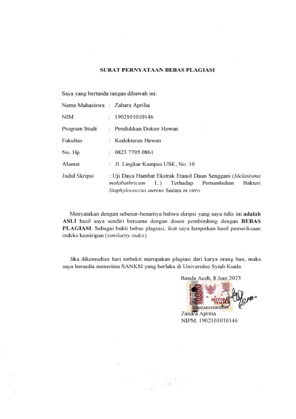 Zahara Aprilia, UJI DAYA HAMBAT EKSTRAK ETANOL DAUN SENGGANI (MELASTOMA MALABATHRICUM L.) TERHADAP PERTUMBUHAN BAKTERI STAPHYLOCOCCUS AUREUS SECARA IN VITRO. Banda Aceh Fakultas Kedokteran Hewan,2023