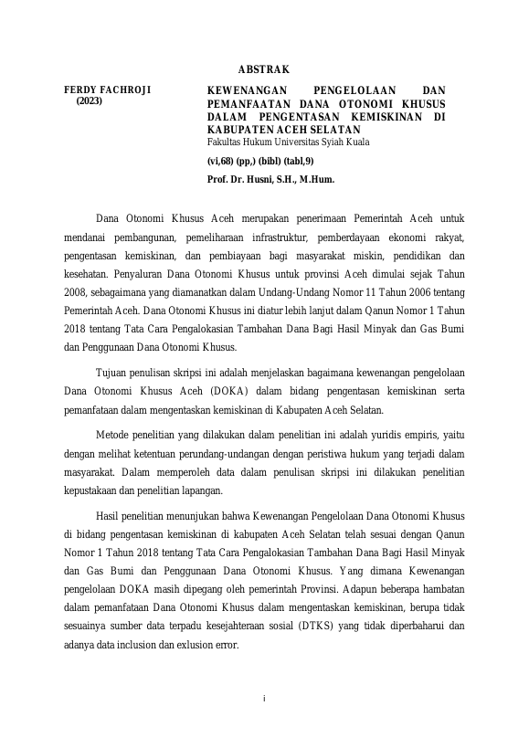 FERDI FACHROJY, KEWENANGAN PENGELOLAAN DAN PEMANFAATAN DANA OTONOMI KHUSUS DALAM PENGENTASAN KEMISKINAN DI KABUPATEN ACEH SELATAN. Banda Aceh Fakultas Hukum,2023
