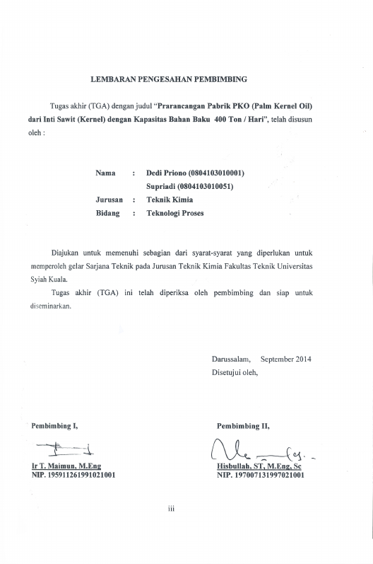 Supriadi, PRARANCANGAN PABRIK MINYAK INTI KELAPA SAWIT ( PALM KERNEL OIL) DARI INTI SAWIT (PALM KERNEL) DENGAN KAPASITAS BAHAN BAKU 400 TON/HARI. Banda Aceh Fakultas Teknik,2014