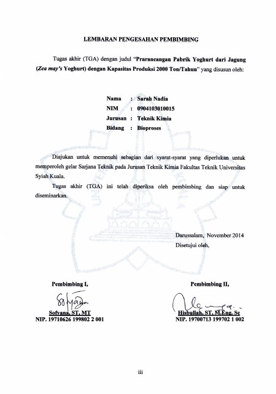 Sarah Nadia, PRARANCANGAN PABRIK YOGHURT DARI JAGUNG (ZEA MAY’S YOGHURT) DENGAN KAPASITAS PRODUKSI 2.000 TON/TAHUN. Banda Aceh Fakultas Teknik Kimia,2014