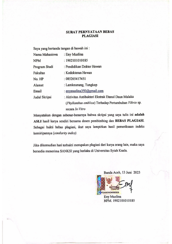 Baca Juga : AKTIVITAS ANTIBAKTERI EKSTRAK ETANOL DAUN MALAKA (PHYLLANTHUS EMBLICA) TERHADAP PERTUMBUHAN VIBRIO SP. SECARA IN VITRO (ENY MUSLINA, 2023)