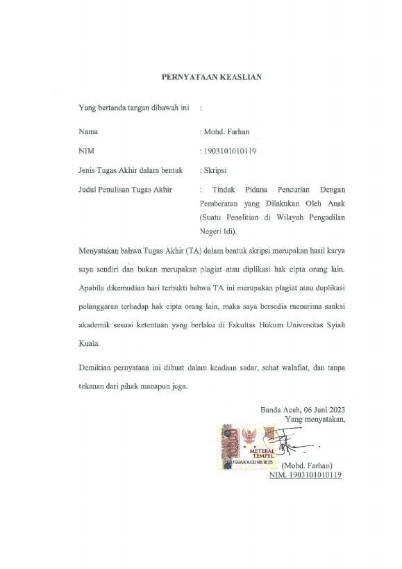 Baca Juga : TINDAK PIDANA PENCURIAN DENGAN PEMBERATAN YANG DILAKUKAN OLEH ANAK (SUATU PENELITIAN DI WILAYAH HUKUM PENGADILAN NEGERI IDI) (Mohd.farhan, 2023)