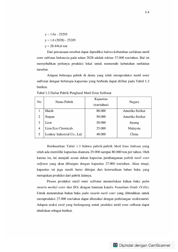 Baca Juga : PRARANCANGAN PABRIK SURFAKTAN METIL ESTER SULFONAT DARI PALM STEARIN METHYL ESTER DENGAN KAPASITAS PRODUKSI 27.000 TON/TAHUN (Khairunissa Ulfitri, 2023)