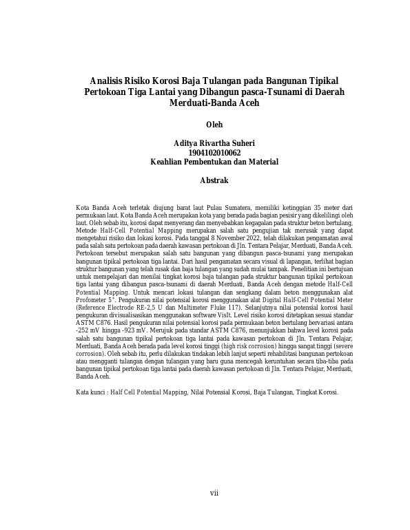 ADITYA RIVARTHA SUHERI, ANALISIS RISIKO KOROSI BAJA TULANGAN PADA BANGUNAN TIPIKAL PERTOKOAN TIGA LANTAI YANG DIBANGUN PASCA–TSUNAMI DI DAERAH MERDUATI–BANDA ACEH. Banda Aceh Teknik Mesin dan Industri,2023