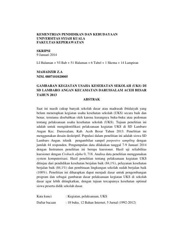 MAHADZIR Z.A, GAMBARAN KEGIATAN USAHA KESEHATAN SEKOLAH (UKS) DI SD LAMBARO ANGAN KECAMATAN DARUSSALAM ACEH BESAR TAHUN 2013. Banda Aceh Fakultas Keperawatan,2014