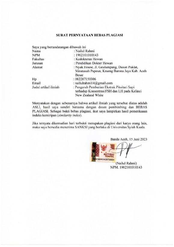 Baca Juga : PENGARUH PEMBERIAN EKSTRAK PITUITARI SAPI TERHADAP KONSENTRASI FSH DAN LH PADA KELINCI NEW ZEALAND WHITE (Nailul Rahmi, 2023)