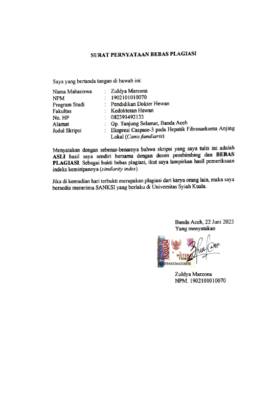 Zuldya Marzona, EKSPRESI CASPASE-3 PADA HEPATIK FIBROSARKOMA ANJING LOKAL (CANIS FAMILIARIS). Banda Aceh Fakultas Kedokteran Hewan,2023