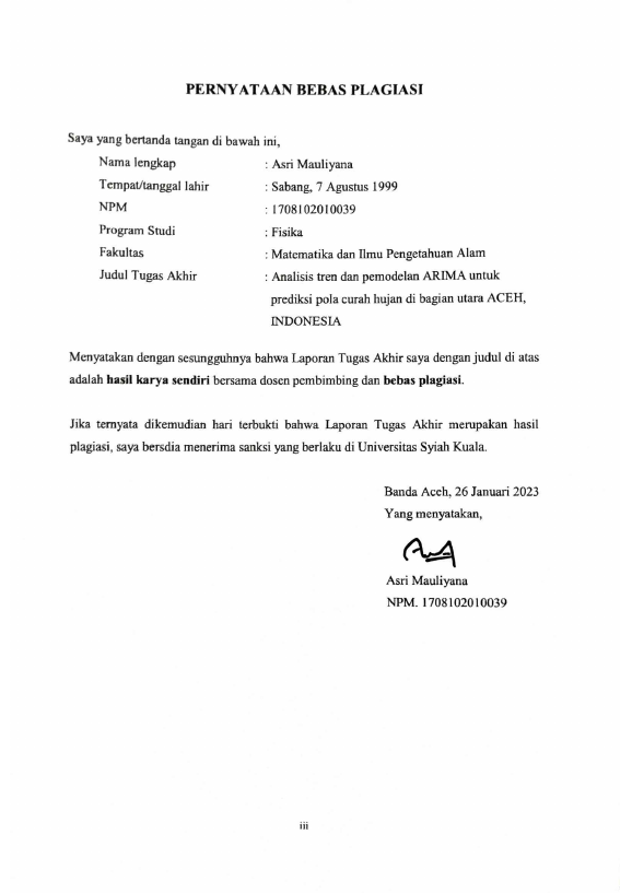 ASRI MAULIYANA, ANALISIS TREN DAN PEMODELAN ARIMA RNUNTUK PREDIKSI POLA CURAH HUJAN DIRNBAGIAN UTARA ACEH, INDONESIA. Banda Aceh Fakultas mipa,2023
