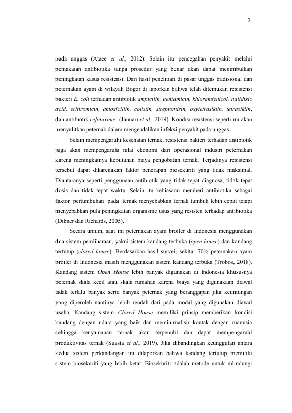 Irwan, SURVEI PENERAPAN BIOSEKURITI DAN PREVALENSI E. COLI RESISTEN TERHADAP ANTIBIOTIK SERTA PERHITUNGAN NILAI EKONOMI PADA KANDANG BROILER SISTEM TERBUKA DAN TERTUTUP DI KABUPATEN ACEH JAYA. Banda Aceh Program Studi Magister Kesehatan Masyarakat Veteriner Universitas Syiah Kuala,2023