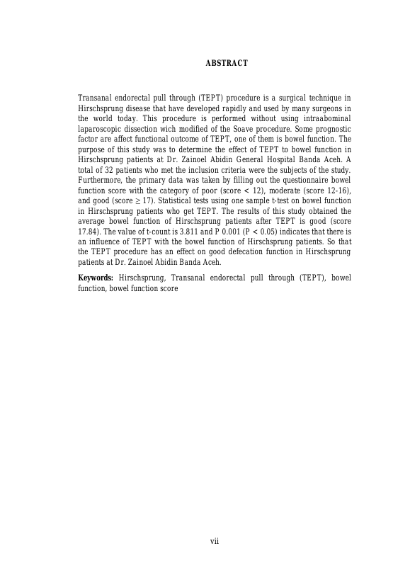 Baca Juga : OUTCOME PASIEN PENYAKIT HIRSCHSPRUNG PASCA OPERASI TRANSANAL ENDORECTAL PULL THROUGH (TEPT) DI RSUD DR. ZAINOEL ABIDIN BANDA ACEH (Hawanur Husna, 2014)
