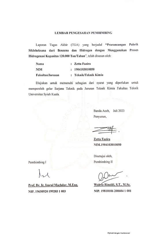 Baca Juga : PRARANCANGAN PABRIK SIKLOHEKSANA DARI BENZENA DAN HIDROGEN DENGAN MENGGUNAKAN PROSES HIDROGENASI KAPASITAS 120.000 TON/TAHUN (Zetta Fazira, 2023)