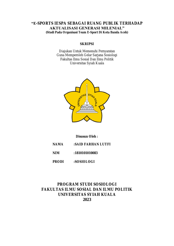 SAID FARHAN LUTFI, “E-SPORTS IESPA SEBAGAI RUANG PUBLIK TERHADAP AKTUALISASI GENERASI MILENIAL”(STUDI PADA ORGANISASI TEAM E-SPORT DI KOTA BANDA ACEH). Banda Aceh Fakultas Ilmu Sosial dan Politik,2023