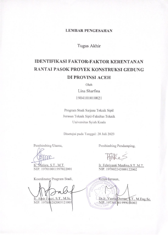 Lina Sharfina, IDENTIFIKASI FAKTOR-FAKTOR KERENTANAN RANTAI PASOK PROYEK KONSTRUKSI GEDUNG DI PROVINSI ACEH. Banda Aceh Fakultas Teknik Sipil,2023