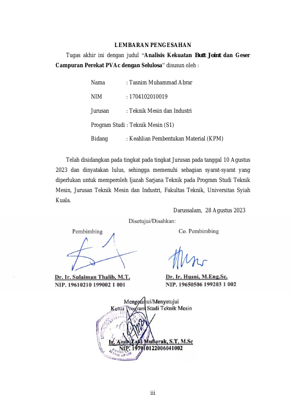 TASNIM MUHAMMAD ABRAR, ANALISIS KEKUATAN BUTT JOINT DAN GESER CAMPURAN PEREKAT PVAC DENGAN SELULOSA. Banda Aceh Teknik Mesin dan Industri,2023