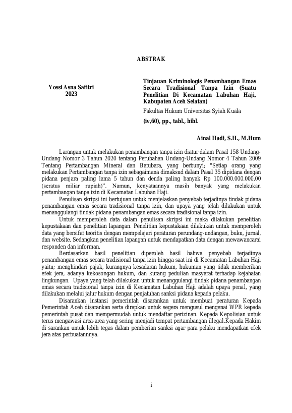 YOSSI ASNA SAFITRI, TINJAUAN KRIMINOLOGIS PENAMBANGAN EMAS SECARA TRADISONAL TANPA IZIN (SUATU PENELITIAN DI KECAMATAN LABUHAN HAJI, KABUPATEN ACEH SELATAN). Banda Aceh Fakultas Hukum,2023