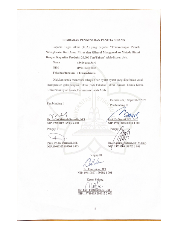 Syilviana Asri, PRARANCANGAN PABRIK NITROGLISERIN DARI ASAM NITRAT DAN GLISEROL MENGGUNAKAN METODE BIAZZI DENGAN KAPASITAS PRODUKSI 20.000 TON/TAHUN. Banda Aceh Fakultas Teknik Kimia,2023