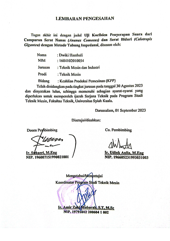 DWIKI HAMBALI, UJI KOEFISIEN PENYERAPAN SUARA DARI CAMPURAN SERAT NANAS (ANANAS COMOSUS) DAN SERAT BIDURI (CALOTROPIS GIGANTEA) DENGAN METODE TABUNG IMPEDANSI. Banda Aceh Teknik Mesin dan Industri,2023