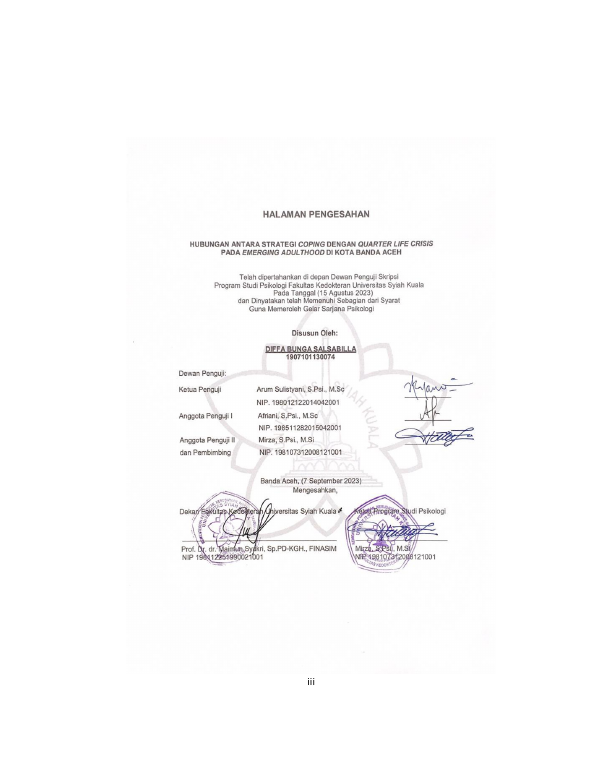 diffa bunga salsabilla, HUBUNGAN ANTARA STRATEGI COPING DENGAN QUARTER LIFE CRISIS PADA EMERGING ADULTHOOD DI KOTA BANDA ACEH. Banda Aceh Fakultas Kedokteran Psikologi,2023