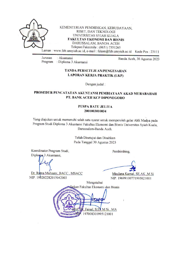 Puspa Ratu Jelita, PROSEDUR PENCATATAN AKUNTANSI PEMBIAYAAN AKAD MURABAHAH PT. BANK ACEH SYARIAH KCP DIPONEGORO. Banda Aceh Fakultas Ekonomi (D3),2023