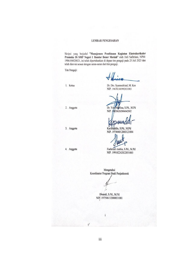 Deli Safitriani, MANAJEMEN PEMBINAAN KEGIATAN EKSTRAKURIKULER PRAMUKA DI SMP NEGERI 1 BANDAR BENER MERIAH. Banda Aceh Fakultas KIP Pendidikan Olahraga,2023