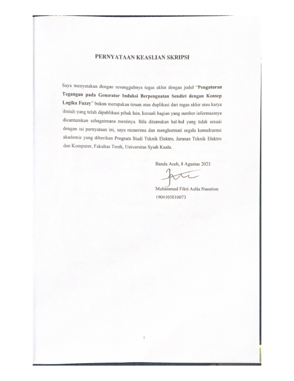 MUHAMMAD FIKRI AULIA NASUTION, PENGATURAN TEGANGAN PADA GENERATOR INDUKSI BERPENGUATAN SENDIRI DENGAN KONSEP LOGIKA FUZZY. Banda Aceh Fakultas Teknik Elektro dan Komputer,2023