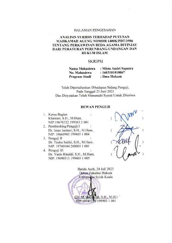 MISTA ANDRI SAPUTRA, ANALISIS YURIDIS TERHADAP PUTUSAN MAHKAMAH AGUNG NOMOR 1400K/PDT/1986 TENTANG PERKAWINAN BEDA AGAMA DITINJAU DARI PERATURAN PERUNDANG-UNDANGAN DAN HUKUM ISLAM. Banda Aceh Fakultas Hukum,2023