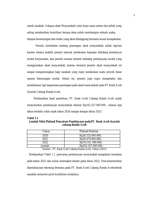 Putri Alya Zulfikri, PENERAPAN AKAD MUSYARAKAH PADA PEMBIAYAAN MODAL KERJA PT BANK ACEH SYARIAH CABANG BANDA ACEH. Banda Aceh Fakultas Ekonomi dan Bisnis Akuntansi (D3),2023