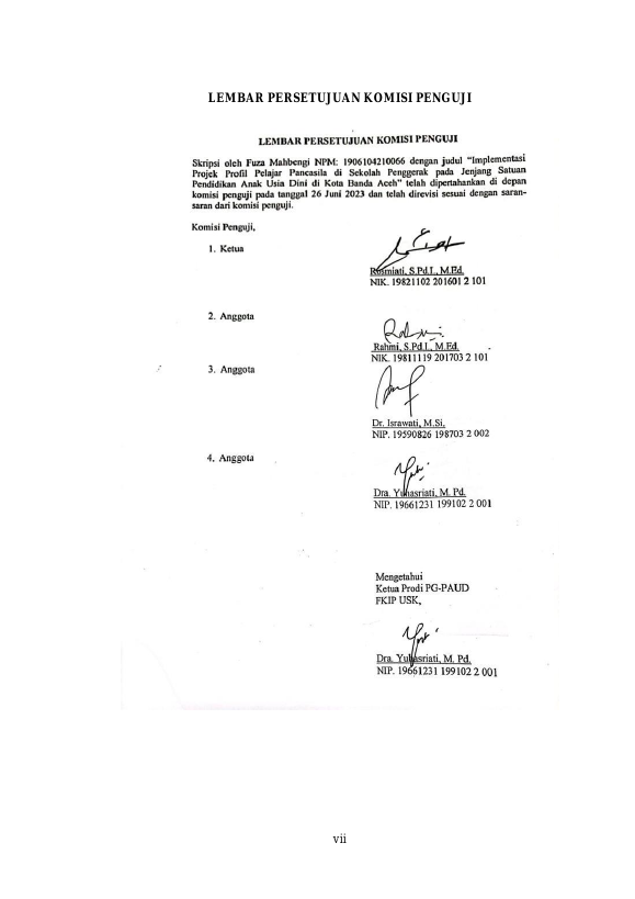 Fuza Mahbengi, IMPLEMENTASI PROJEK PROFIL PELAJAR PANCASILA DI SEKOLAH PENGGERAK PADA JENJANG SATUAN PENDIDIKAN ANAK USIA DINI DI KOTA BANDA ACEH. Banda Aceh Fakultas FKIP,2023