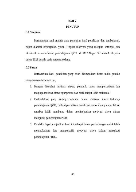 INDRA MULIA SINAMBELA, MOTIVASI SISWA TERHADAP PEMBELAJARAN PJOK DI SMP NEGERI 3 BANDA ACEH PADA TAHUN 2023. Banda Aceh Fakultas FKIP,2023