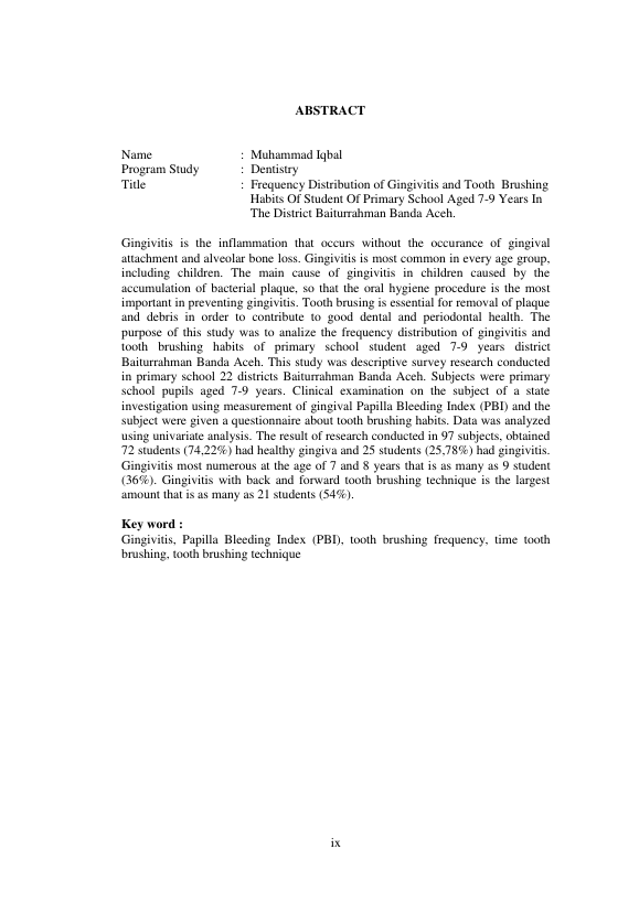 Baca Juga : DISTRIBUSI FREKUENSI GINGIVITIS DAN ORAL HYGIENE MURID SDN 22 USIA 10-12 TAHUN KECAMATAN BAITURRAHMAN BANDA ACEH (Nurul fajri, 2023)