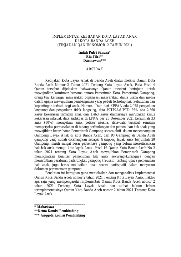Indah Putri Sanura, IMPLEMENTASI KEBIJAKAN KOTA LAYAK ANAK DI KOTA BANDA ACEH (TINJAUAN QANUN NOMOR 2 TAHUN 2021). Banda Aceh Program Studi Magister Ilmu Hukum,2023