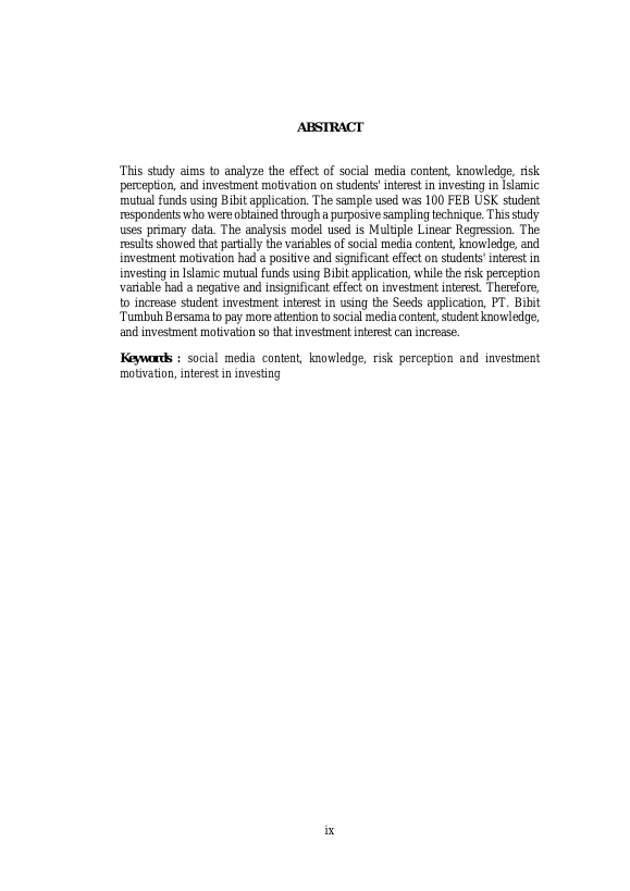 Anindita Seroja, ANALISIS FAKTOR-FAKTOR YANG MEMPENGARUHI MINAT MAHASISWA TERHADAP INVESTASI REKSADANA SYARIAH MENGGUNAKAN APLIKASI BIBIT. Banda Aceh Fakultas Ekonomi,2023