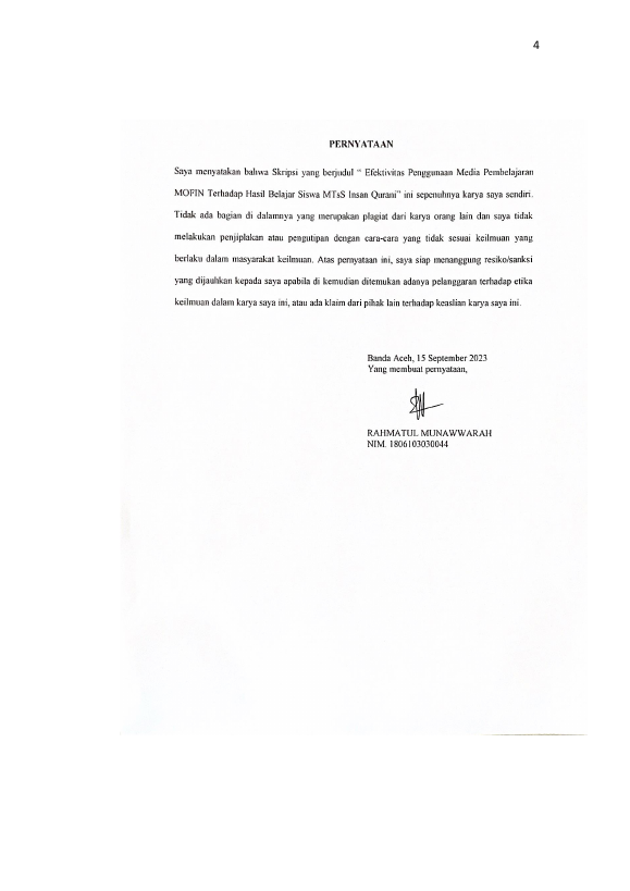RAHMATUL MUNAWWARAH, EFEKTIVITAS PENGGUNAAN MEDIA PEMBELAJARAN MOFIN TERHADAP HASIL BELAJAR SISWA MTSS INSAN QURANI. Banda Aceh Fakultas FKIP,2023