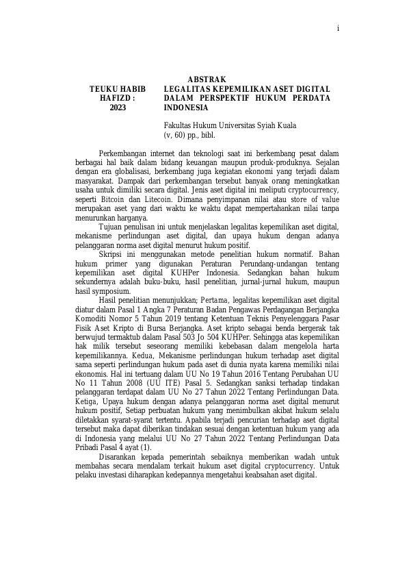 TEUKU HABIB HAFIZD, LEGALITAS KEPEMILIKAN ASET DIGITAL DALAM PERSPEKTIF HUKUM PERDATA INDONESIA. Banda Aceh Fakultas Hukum,2023