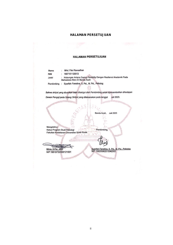 Mhd. Fikri Ramadhan, HUBUNGAN ANTARA COPING FLEXIBILITY DENGAN RESILIENSI AKADEMIK PADA MAHASISWA BARU DI BANDA ACEH. Banda Aceh Fakultas Kedokteran Psikologi,2023